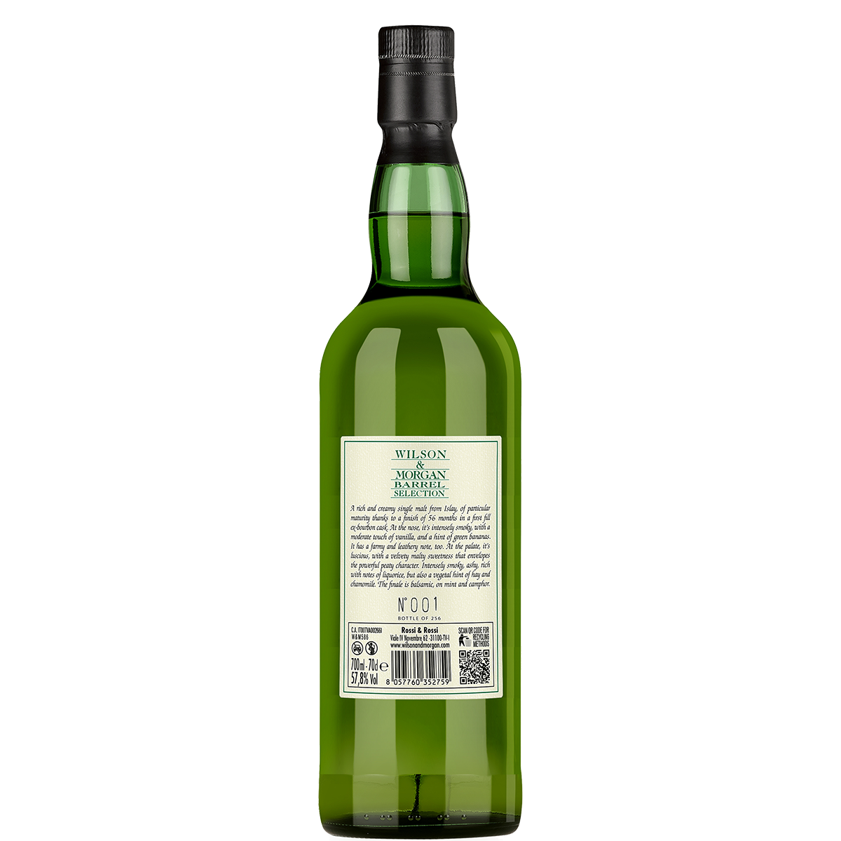 A rich and creamy single malt from Islay, of particular maturity thanks to a very long finish of 56 months in a first fill ex-bourbon cask. At the nose, it’s intensely smoky, with a moderate touch of vanilla, and a hint of green bananas. It has a farmy and leathery note, too. The long influence of the fresh bourbon cask is most noticeable at the palate, preferably with a drop of water to release its nuances: extremely luscious, caressing, with a velvety malty sweetness that envelopes the powerful peaty character. It still is intensely smoky, ashy, rich with notes of liquorice, but also a vegetal hint, of hay and chamomile. Ultimately very peated, but also balanced and never aggressive. The finale is balsamic, on mint and camphor.