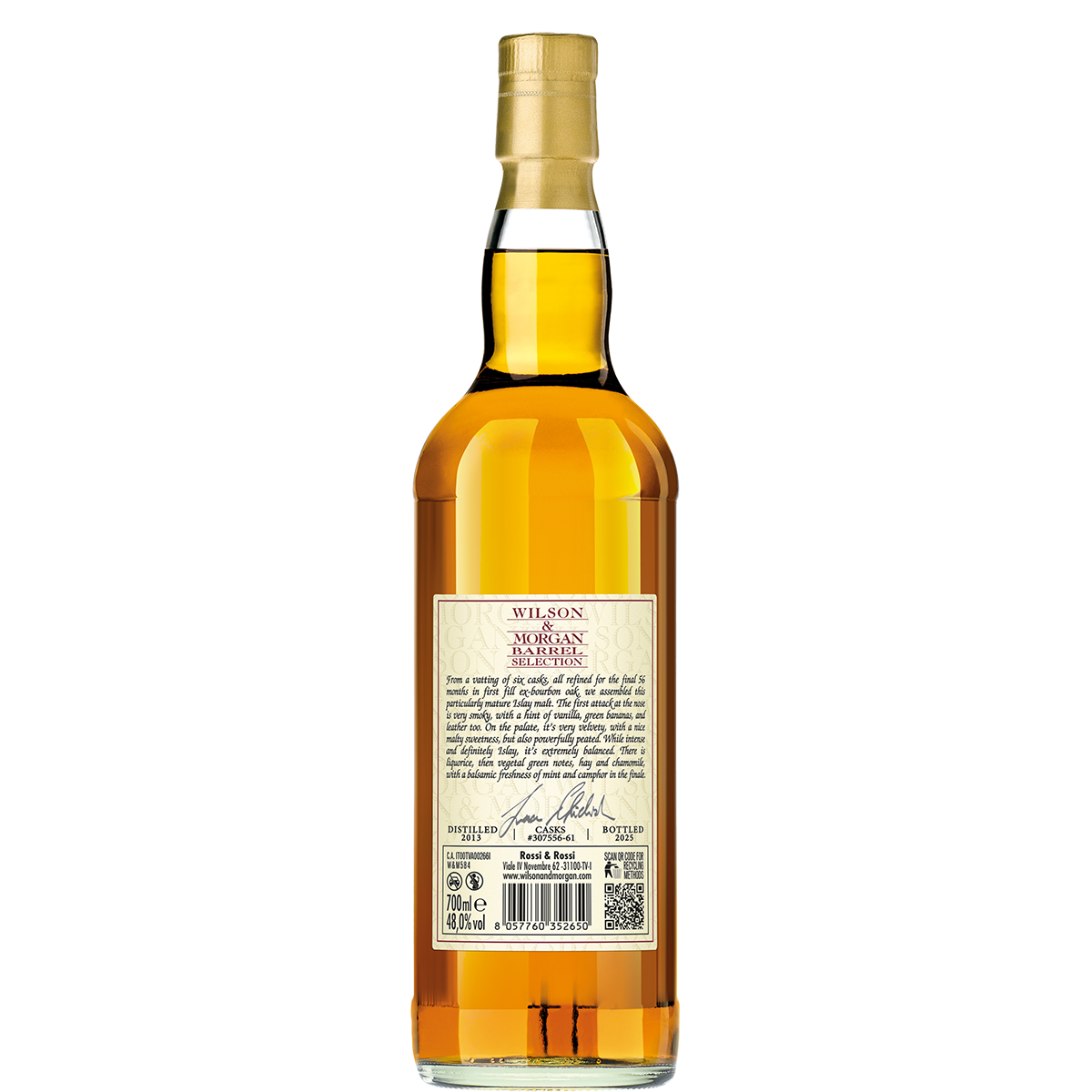 From a vatting of six casks from the same distillation batch, all refined for the final 56 months in first fill ex-bourbon oak, we assembled this particularly mature Islay malt: its creamy, round character is the result we were aiming at with such a long finish. But this doesn’t mean that the peat takes second place: on the contrary, the first attack at the nose is very smoky. A hint of vanilla, green bananas, and leather too. We chose the perfect drinking dilution for this bottling, so you don’t need to add water: it’s very velvety, with a nice malty sweetness, but also powerfully peated. Quite simply, while being intense and definitely Islay, it’s extremely balanced. There is liquorice, then vegetal green notes, hay and chamomile, with a balsamic freshness of mint and camphor in the finale.